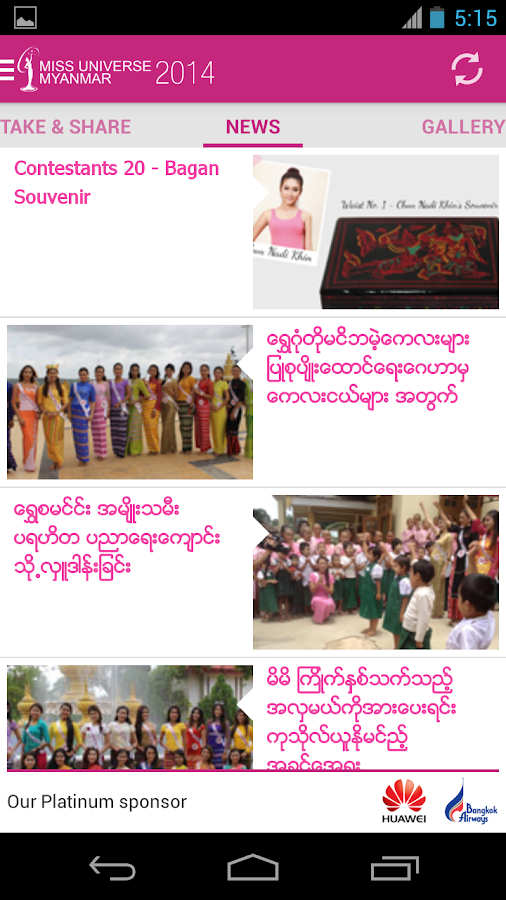 Android phone/Tablet ကုိင္ေဆာင္ျပီး ျမန္မာျပည္မွာက်င္းပေတာ့ Miss Universe Myanmar အေၾကာင္းကုိ စုံစုံလင္လင္သိရွိႏုိင္မယ့္ Android ေဆာ့၀ဲလ္ေလး Miss Universe Myanmar ကုိတင္ေပးလုိက္ပါတယ္။ဒီေဆာ့၀ဲလ္ေလး မိမိတုိ႕ဖုန္းထဲထည့္ထားရုံျဖင့္ Miss Universe Myanmar ႏွင့္ပတ္သတ္ေသာ သတင္းမ်ား၊ဓာတ္ပုံမ်ား၊ခရီးသြားေနမႈမ်ား၊ျပိဳင္ပြဲယွဥ္ျပဳိင္ေနမႈမ်ားကုိ ၾကည့္ရႈႏုိင္မွာျဖစ္ပါတယ္။ေအာက္မွာရယူႏုိင္ပါတယ္။